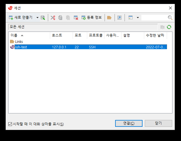 - 그러면 "세션" 창에 입력한 연결 정보가 추가가 되는데 더블 클릭하면 서버로 연결 요청을 보냅니다.