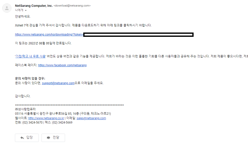 - 이메일을 확인해보면 xshell 다운로드 링크가 포함된 메일이 와있습니다! 링크를 눌러서 파일을 설치합니다.