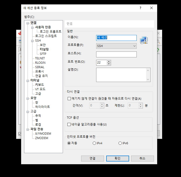 - 화면 가운데에 조그맣게 뜬 "세션" 창의 좌측 상단에 있는 "새로 만들기" 버튼을 클릭하면 다음과 같은 창이 뜹니다.