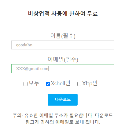 - https://www.netsarang.com/ko/free-for-home-school/ 링크에 들어가셔서 아래 이미지처럼 이메일을 입력하고 다운로드를 클릭하면 다음 페이지로 넘어갑니다.