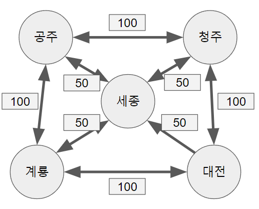 의형제 그래프에서는 우애를 숫자로 표현할 수 없기에 단순히 관계만 보여줬지만 지역 간 거리는 숫자로 표현할 수 있어서 위와 같이 표현하게 되었습니다.
