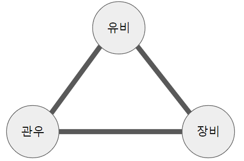 유비, 관우, 장비 노드 3개가 있고, 각각의 노드가 다른 노드들과 연결되어 있는 그래프입니다.