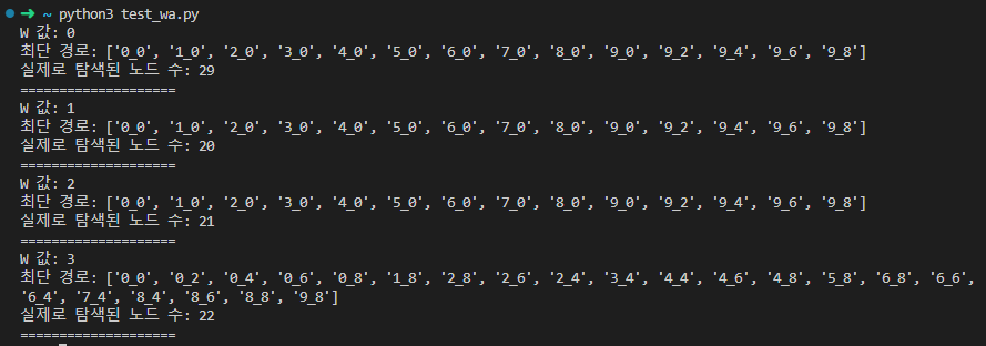 - W=3 부터 비효율적인 경로를 반환하게 되는 것을 확인할 수 있습니다 ㅜㅠ