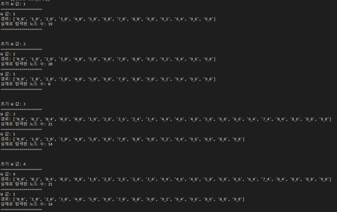 W 값이 바뀔 때마다 f `이 자동으로 재계산되어야 해서 heuristic 함수에서 W 값을 전역 변수로 읽어오게 수정했습니다.