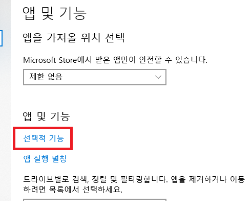 - "앱" 창에서 "선택적 기능" 을 누릅니다.