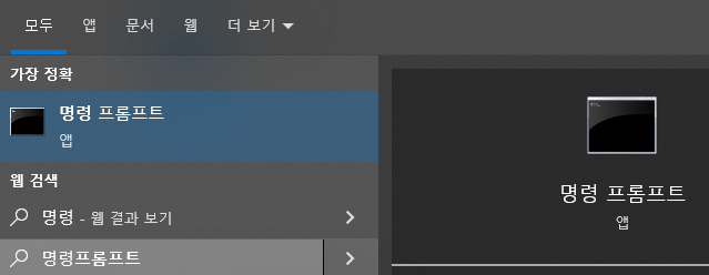 - 명령 프롬프트창은 시작 창에서 "명령 프롬프트" 혹은 "cmd"를 입력하면 나오는 명령 프롬프트를 실행하면 됩니다.
