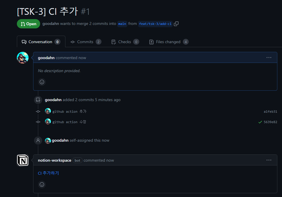 4. Github Pull Request 에 노션봇이 작성한 comment