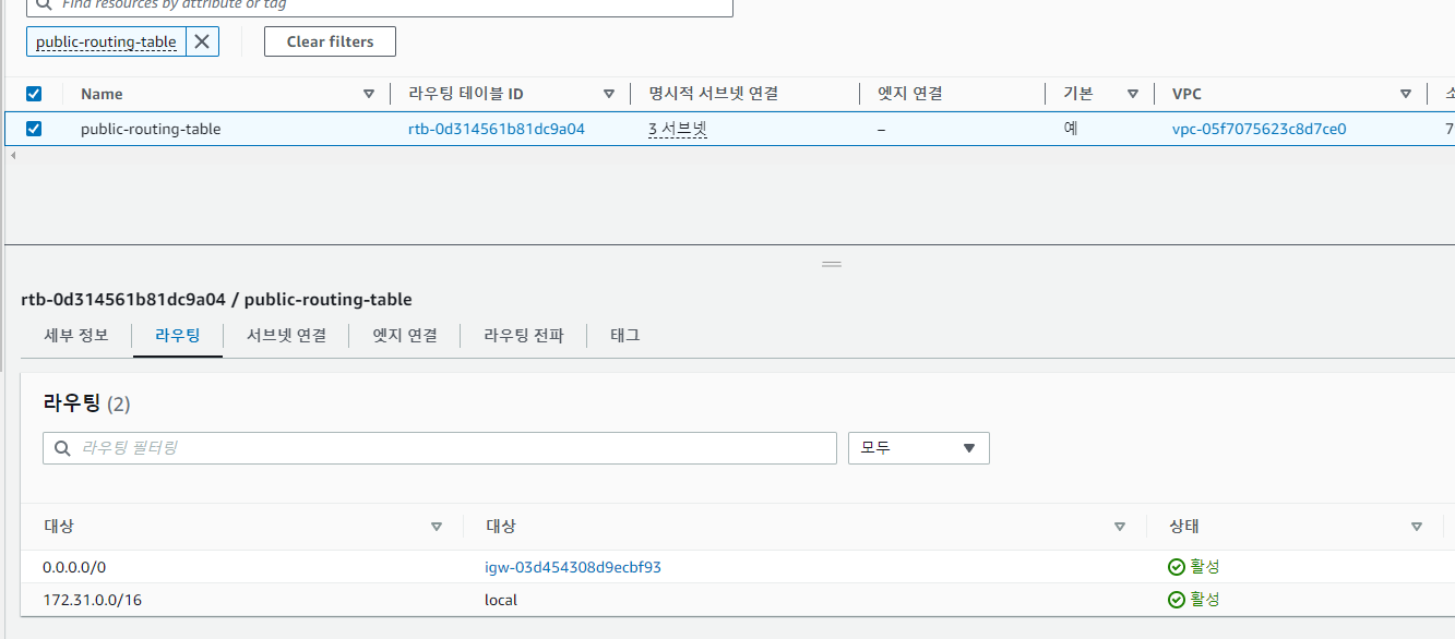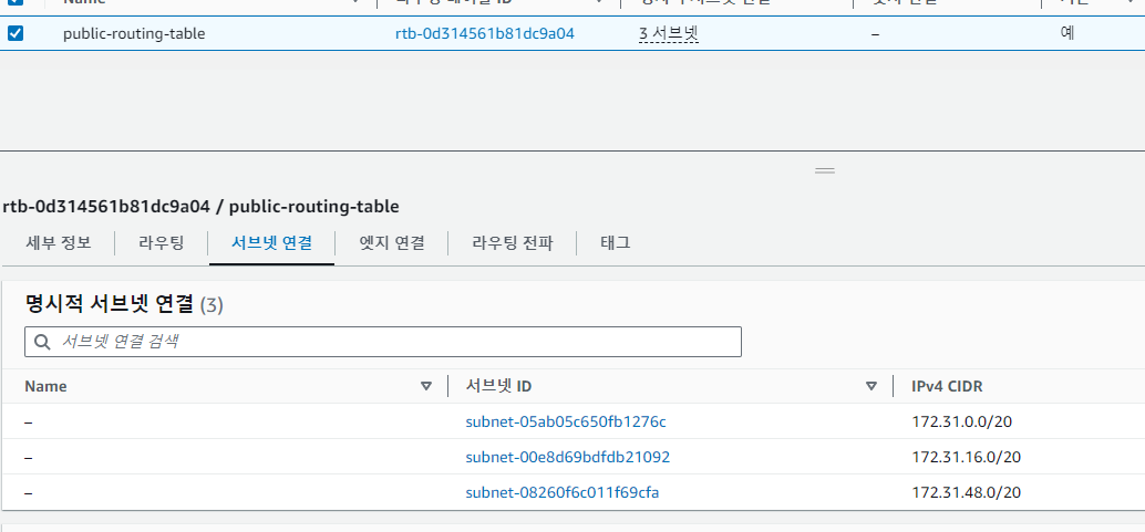 저는 기본 routing table을 public routing table이라고 이름 짓고 기본 서브넷 4개 중에서 3개만 연결시켰습니다.