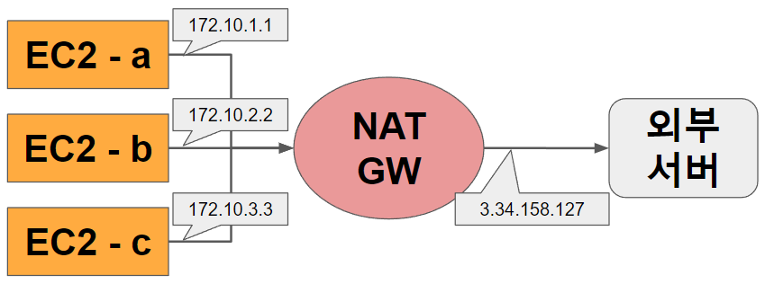 인스턴스들이 외부 서버로 요청을 보낼 때, NAT Gateway를 경유하게 되면 외부 서버가 받은 요청의 헤더에는 NAT Gateway의 IP가 찍히게 됩니다.