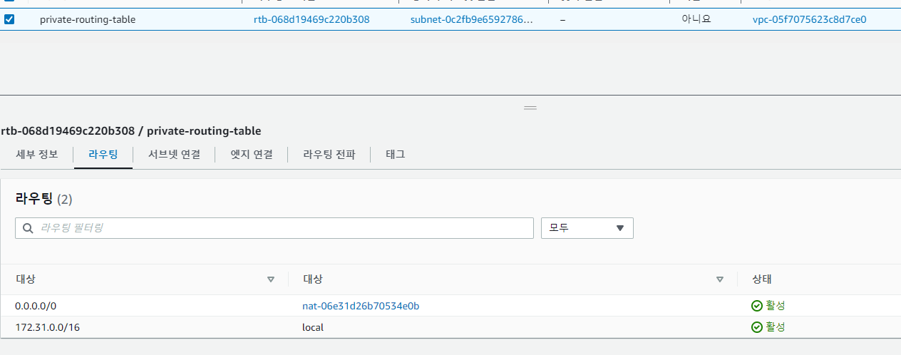 그리고 private subnet으로 구성할 subnet을 private routing 테이블에 연결했습니다.