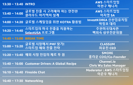 - 글로벌 진출을 준비중인 스타트업을 위한 지원 프로그램 소개(KOTRA, 주한미국대사관) 및 해외진출 경험 공유(CLASSUM, SMORE, Channel.io)