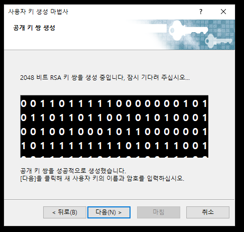 - 공개키 생성한다는 창이 뜨는데 생성이 완료된 후에 다음을 클릭합니다.