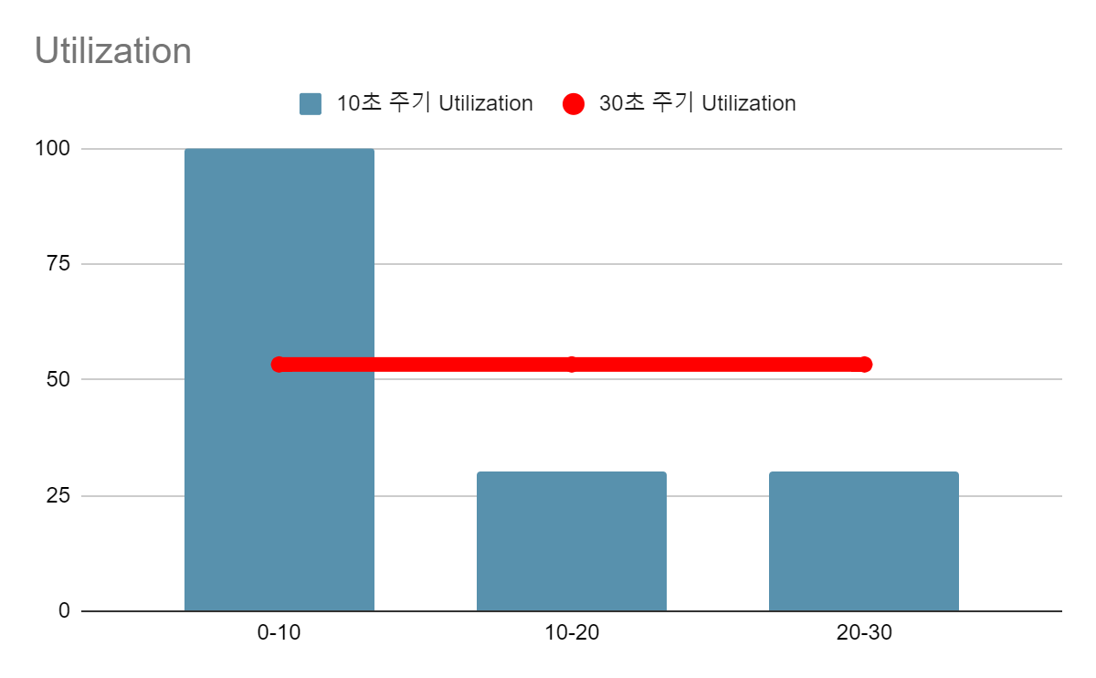 예를 들어, 측정 주기가 30초일 때, 0초에서 10초 동안 Utilization이 100%를 찍고 10초에서 30초 동안 Utilization이 30%였다면 Utilization이 53%로 측정될 것입니다.
