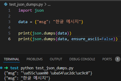 해결 방법은 정말 간단하게도 json.dumps 함수를 호출할 때 ensure_ascii=False 인자를 추가해주는 것입니다.