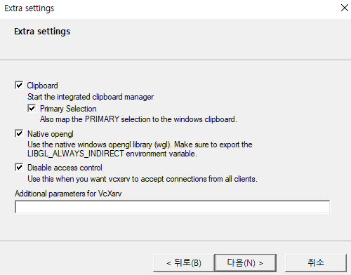 VcXsrv가 설치된 경로에서 xlaunch.exe를 실행해서 다음 설정을 마쳐줍니다.