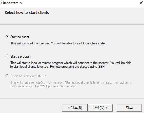 2. Start no client를 선택하고 다음 버튼을 클릭합니다.