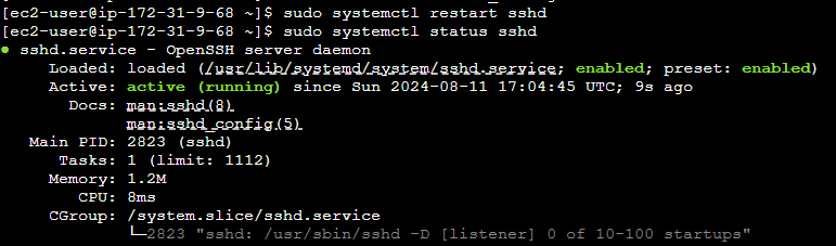 - sudo systemctl status sshd 명령어로 ssh 서버가 재실행된 것을 확인할 수 있습니다.