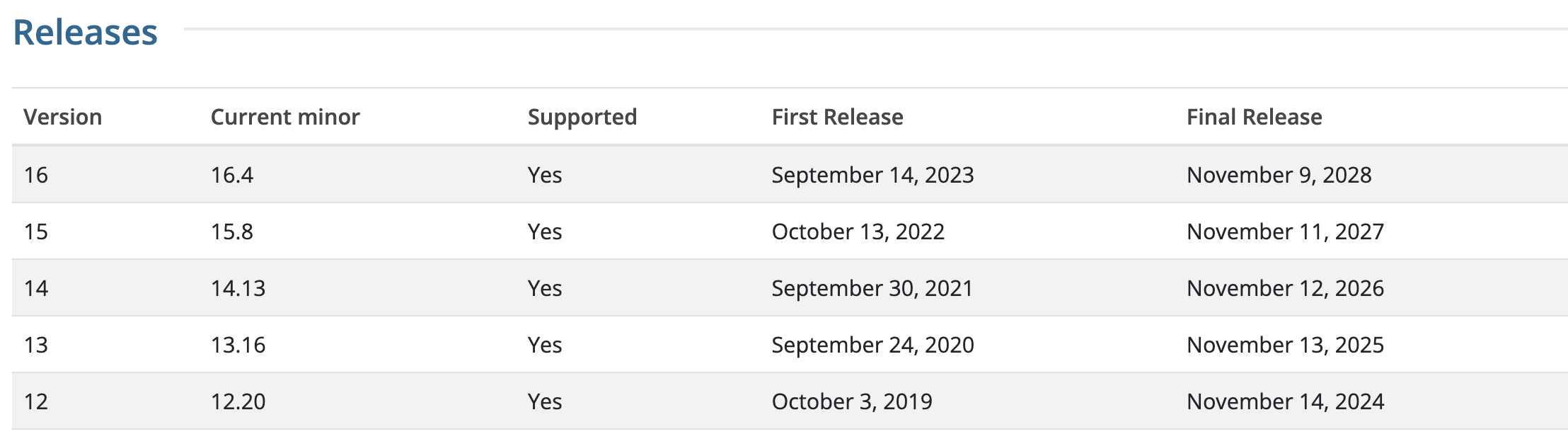PostgresQL 커뮤니티에서도 오래된 버전은 더 이상 관리하지 않는데