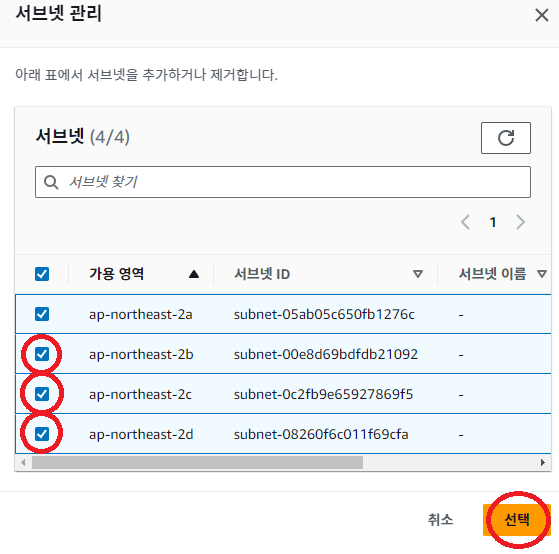 4. 원하는 가용 영역에 포함된 서브넷만 남겨두고 "선택" 버튼을 클릭합니다.