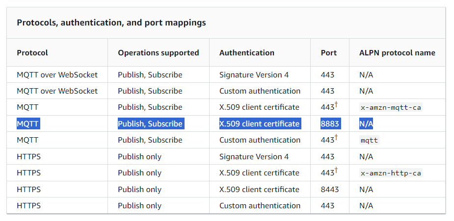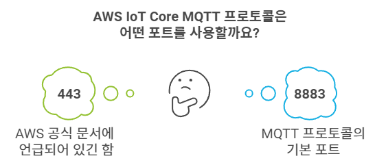 AWS IoT Core 서비스의 공식 문서를 보면 MQTT 프로토콜에는 443 포트와 8883 포트를 사용된다는 것을 알 수 있습니다.
