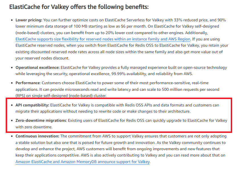 기존에 Redis를 사용하셨던 분들은 엔진을 Valkey로 변경하기만 하면 되는 것이죠...!