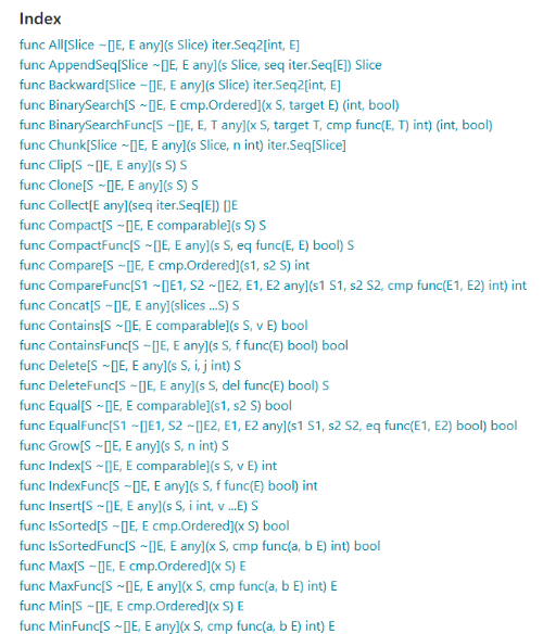 하지만 2023년 2월에 배포된 golang 1.21 버전부터는 slices 패키지가 정식으로 추가되었습니다.
