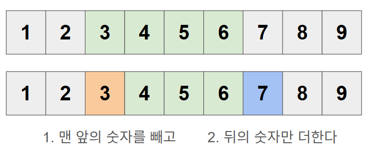 이전에 구한 합에서 맨 앞의 숫자를 빼고 뒤의 숫자만 더해가는 것입니다.