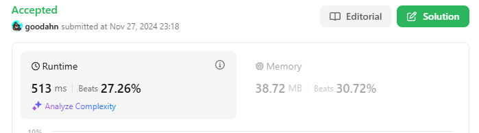 다음에는 leetcode의 솔루션과 다른 풀이가 있는지 찾아봐야겠네요!