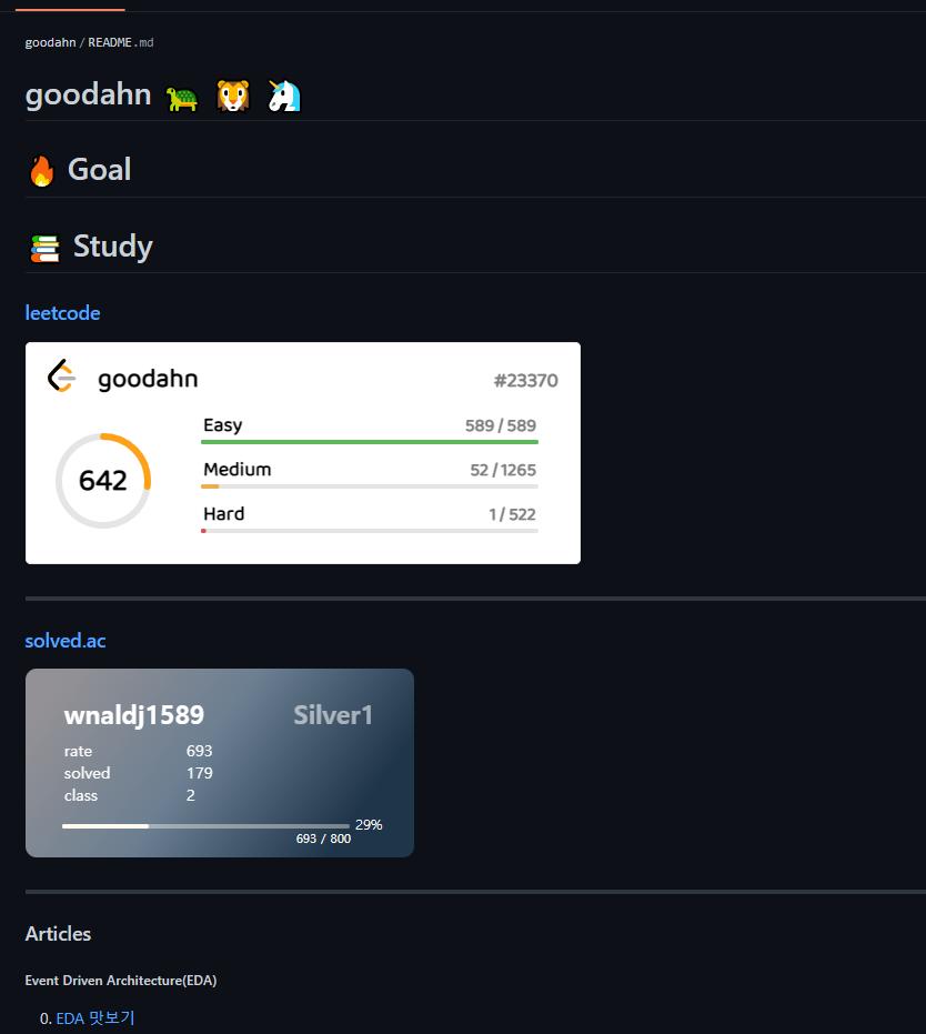저의 프로필에는 공부한 내용들과 단기 목표를 정리하고 있습니다. 아래의 간단한 형식에 내용을 채우고 있습니다 ㅎㅎ