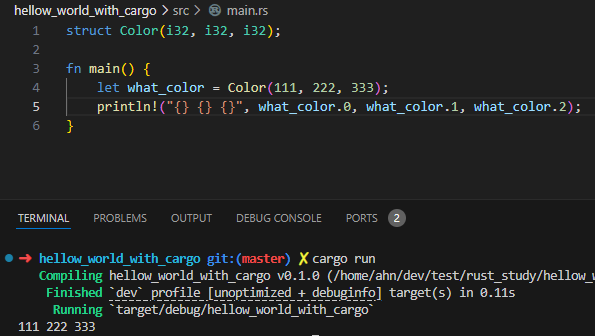tuple을 이용해서 struct를 간단하게 정의하는 방법도 있습니다. 이렇게 정의된 경우에는 필드를 .0, .1, .2, ... 이런 식으로 접근하더라고요?
