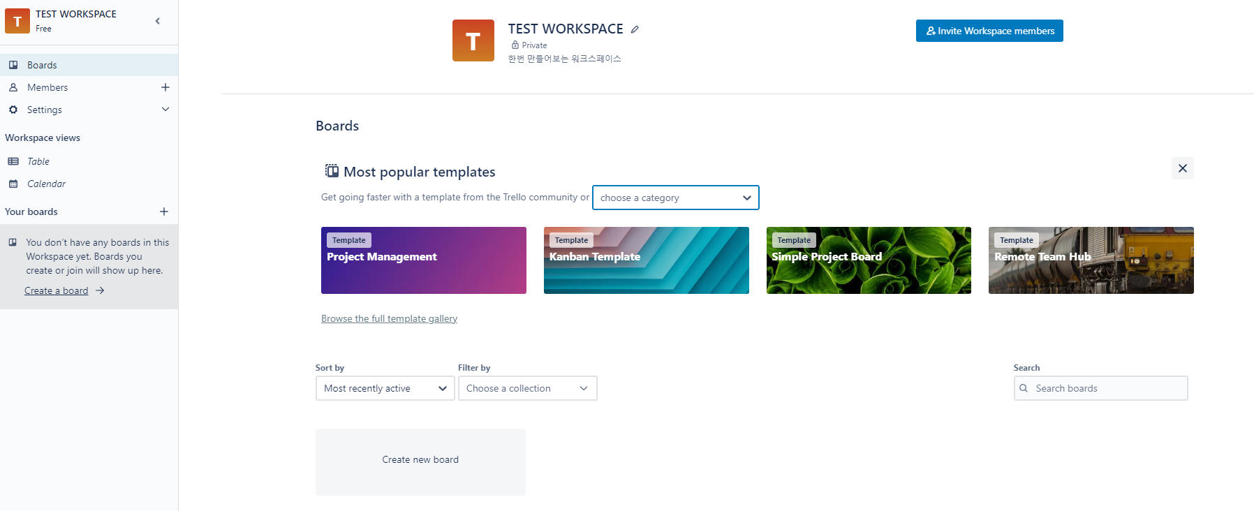 trello에 로그인하면 가입된 워크스페이스와 생성한 보드가 보입니다.