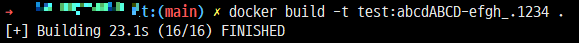실제로 테스트 해보니 허용된 문자로만 이미지 태그가 생성되고 그 외의 문자로 도커 이미지 태그를 설정하려고 하면 에러가 발생하는 것을 확인할 수 있었습니다! 끝!