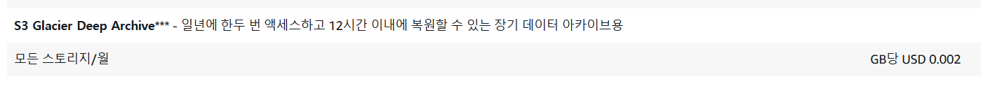 그중에서 Glacier Deep Archive는 GB당 0.002달러로 Standard 클래스 비용의 십 분의 일보다 더 저렴합니다!