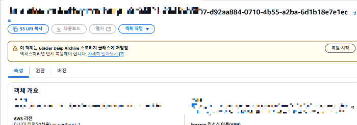 S3 콘솔 페이지에서 Glacier Deep Archive에 저장된 데이터를 조회하면 다음과 같이 다운로드 버튼 대신에 복원 시작 버튼이 활성화되어 있습니다.