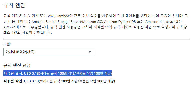 즉, Thing => AWS IoT Core => Rule Engine에서 Thing => AWS IoT Core 로의 전송 비용을 내지 않고 Rule Engine 기능을 사용할 수 있습니다.