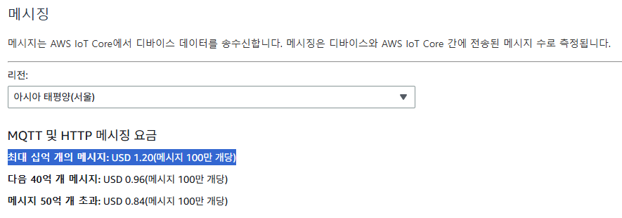 하지만 AWS IoT Core로 전송하는 메시지 100만 개당 1.2달러가 부과됩니다.