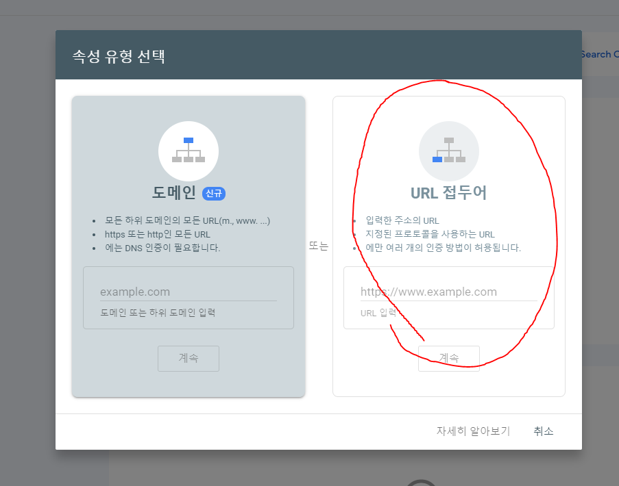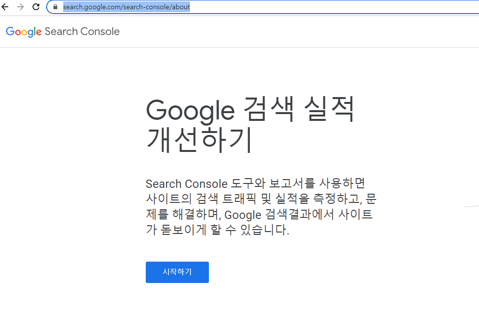 구글 서치 콘솔에 접속해서 시작하기 버튼을 누르면 웹앱을 등록할 수 있습니다.