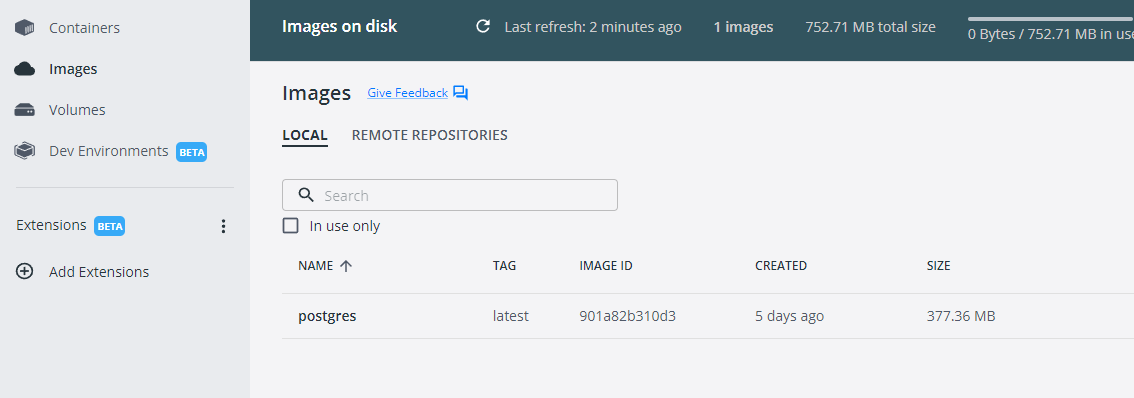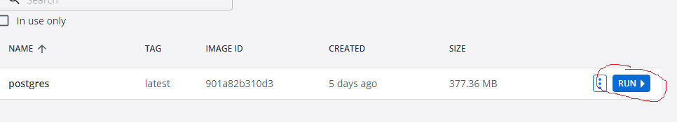 docker 이미지를 pull 받았다면 다음과 같이 docker desktop의 Images 탭에서 이미지를 확인할 수 있습니다.