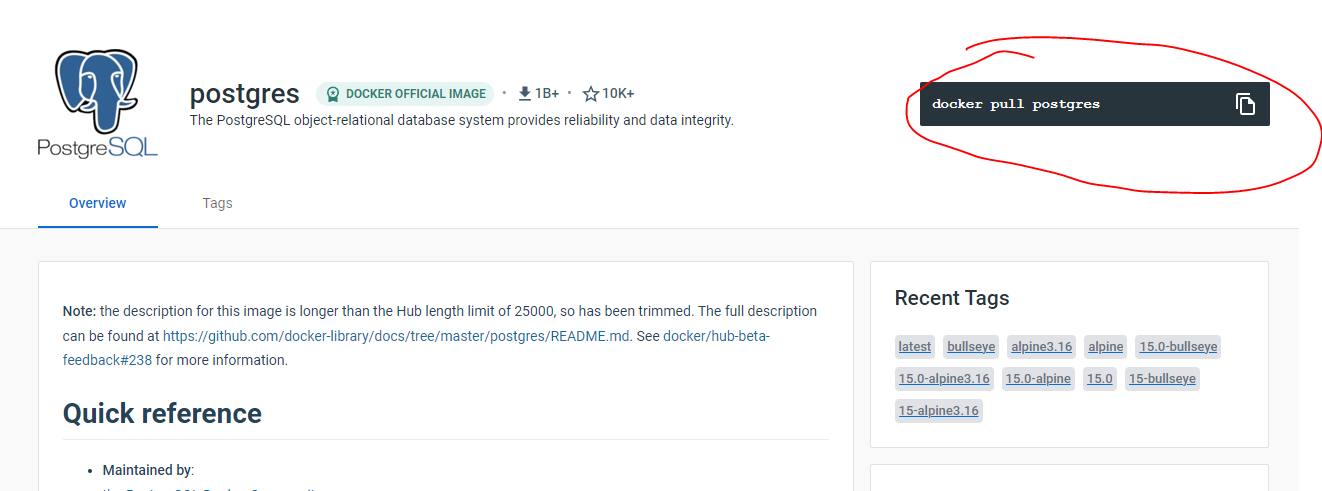 결과를 클릭하면 화면 우측에 docker pull 명령어를 알려줍니다.