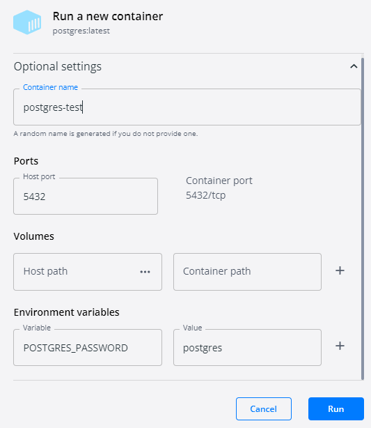 PostgreSQL 컨테이너를 실행하는 예시를 보여드리겠습니다.