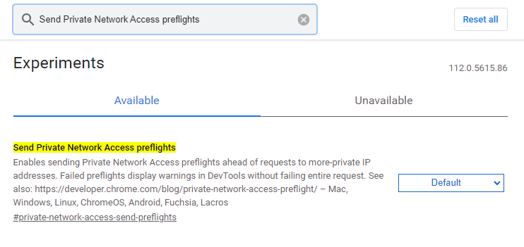 3. Send Private Network Access preflights 를 Disable로 바꾼다.