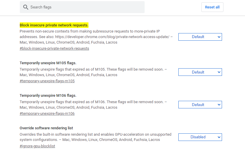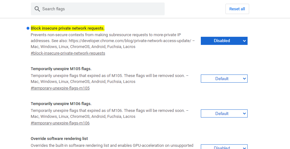 1. 크롬 창에 chrome://flags/#block-insecure-private-network-requests 입력