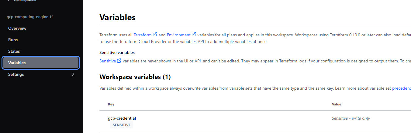 terraform cloud에서 gcp-credential이라는 Variable을 생성해줘야 합니다.