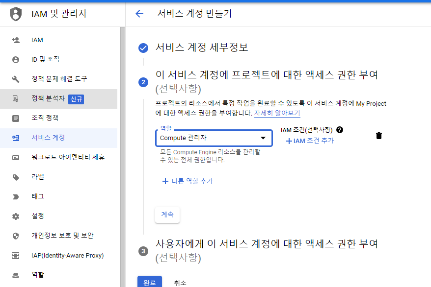 - 서비스 계정을 생성할 때에는 권한을 잘 설정해줘야 해요!