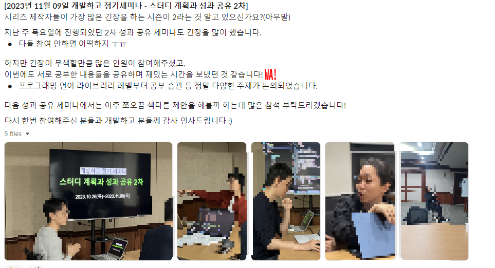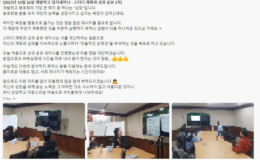 지금까지 1) 각자의 다짐을 발표하고, 다짐을 이루기 위해 노력했던 성과를 발표하는 스터디 계획 및 성과 공유 세미나, 2) 모여서 각자 코딩(모각코), 3) 팀블로그 활동을 진행 중입니다.