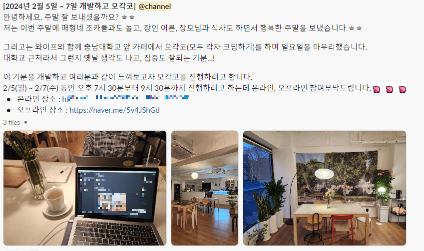 모각코는 올해부터 진행된 활동입니다. 2월 5일에 처음으로 시작되었으며 꽤 자주 모이고 있습니다.